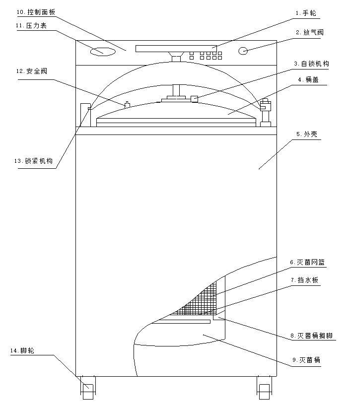 1、逆時(shí)針方向旋轉(zhuǎn)手輪(1)、向右拉開桶蓋(4)、取出滅菌網(wǎng)籃(6)、取出擋水板(7)。
