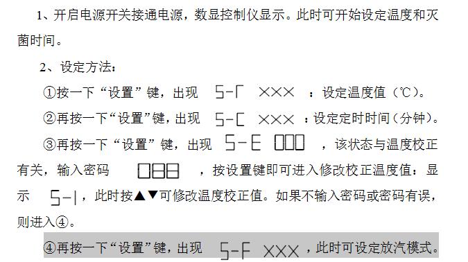 放汽模式有三種可供選擇,模式1:不排汽即滅菌結(jié)束后放汽電磁閥不動(dòng)作。模式2:脈沖排汽即滅菌結(jié)束后放汽電磁閥時(shí)開時(shí)關(guān),以脈沖的形式排汽。模式3:常排汽即滅菌結(jié)束后放汽電磁閥一直打開排汽。選擇好“模式”后按“設(shè)置”鍵返回到溫度顯示,被選擇模式的指示燈亮。