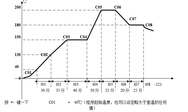 接通電源,按↑鍵二秒鐘使SV窗口出現(xiàn)STOP(暫停)。設(shè)定步驟:按一下←鍵,上排PV顯示C01,表示需要程控的起始溫度,操作←↑↓鍵,使下排SV達(dá)到所需起始溫度。再按下SET鍵,PV顯示t01,表示從起始溫度達(dá)到下一設(shè)定溫度的時(shí)間,操作←↑↓鍵,使SV達(dá)到所需時(shí)間。再按下SET鍵,PV顯示C02,表示剛才設(shè)定的起始溫度C01,用了t01的時(shí)間,所要達(dá)到的溫度,按←↑↓使SV達(dá)到所需溫度。(如需恒溫,則C01與C02設(shè)置同一值),再按下SET鍵,PV顯示t02表示從C02到達(dá)下一溫度的時(shí)間設(shè)定,按前面步驟操作…,**后一段T參數(shù)設(shè)置 “-121”即可自動(dòng)關(guān)機(jī),**多達(dá)30段,**后結(jié)束段將txx設(shè)置-121設(shè)置完畢等SV返回STOP再按↓鍵使顯示窗口出現(xiàn)RUN儀器自動(dòng)按照設(shè)定的程序開(kāi)始工作。程序編排采用溫度--時(shí)間-溫度格式,其定義是從當(dāng)前段設(shè)置溫度,經(jīng)過(guò)該段設(shè)置的時(shí)間到達(dá)一溫度。 例示:按下圖所示程序曲線(xiàn)設(shè)定各段程序值(從40度用30分鐘升到130度再用35分鐘升到150度恒溫40分鐘再用30分鐘升到200度恒溫25分鐘再用20分鐘降到180度再恒溫25分鐘后自然冷卻)