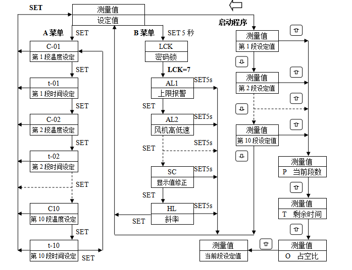 2. 按程序設(shè)定說(shuō)明的操作步驟,設(shè)定所需工作溫度,即測(cè)量值顯示“C-01”時(shí),按需設(shè)定溫度,測(cè)量值顯示“t-01”時(shí),將時(shí)間設(shè)定為**大值“999”,將“t-02”**“t-10”設(shè)為“0”,再恢復(fù)到正常顯示狀態(tài);
