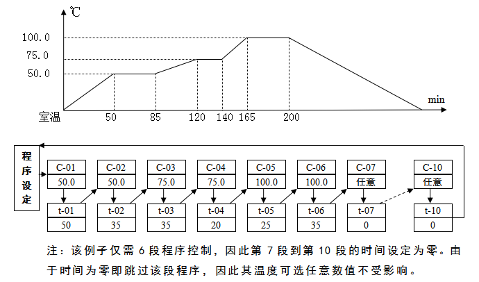 注:該例子僅需6段程序控制,因此第7段到第10段的時(shí)間設(shè)定為零。由于時(shí)間為零即跳過(guò)該段程序,因此其溫度可選任意數(shù)值不受影響。