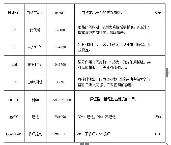 在運(yùn)行過(guò)程中,按“ ”鍵,可查詢當(dāng)前運(yùn)行狀態(tài),設(shè)定值依次顯示段數(shù)為1,時(shí)間為999min,當(dāng)前輸出功率占空比。◆溫度控制參數(shù)