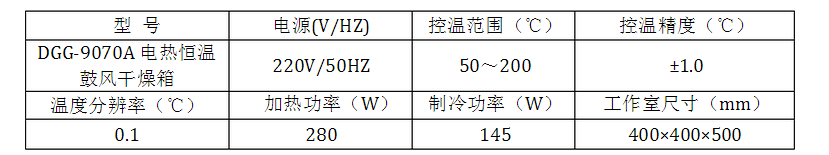 該設備采用高精度微機控溫儀,具有響應快、超調小、精度高的特點,使用輕觸按鍵設定參數,加熱恒溫系統(tǒng)由裝有離心式葉輪的德G優(yōu)質風機、電加熱器、合適的風道結構和溫度控制器組成。當接通干燥箱電源時, 風機即同時運轉,直接將位于箱內底部的電加熱器產生的熱量通過風道向上排出,經過工作室內干燥物品再吸入風機,以此不斷循環(huán),從而使工作室內溫度達到均勻。 4.2 設備主要參數