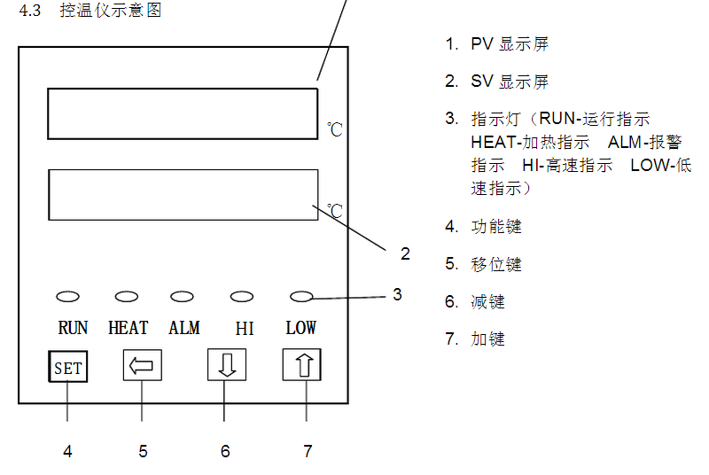 定時結束,SV 窗顯示E n d,末位小數點熄滅,同時切斷加熱。按一下“SET”鍵,儀表恢復到正常的工作狀態(tài)。重新使用如定時無變化,在SV 窗顯示E n d 的狀態(tài)下,只要按 SET 鍵復位即可,如果時間有變化,則需重新設定。