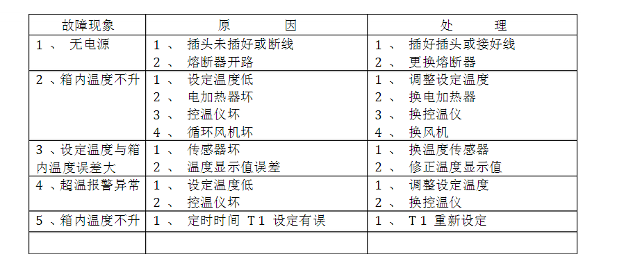 4.7.2 如果運行溫度過高,務必等到設備冷卻以后再取出物品。 4.7.3 箱內物品放置切勿過擠,須流出空間,以利熱空氣循環(huán)。 4.8 維護保養(yǎng)