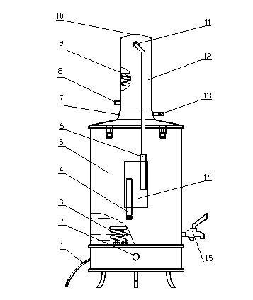 本儀器主要由冷凝器、蒸發(fā)鍋、電熱管三部分組成。主體材料均采用不銹鋼薄板與不銹鋼無(wú)縫管制成,外形美觀(guān)。電加熱管采用浸入式電熱管熱效率高。主要結(jié)構(gòu)如下圖: