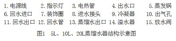 8. 蒸餾水器在工作時(shí),外表溫度較高,切勿接觸,防止?fàn)C傷。